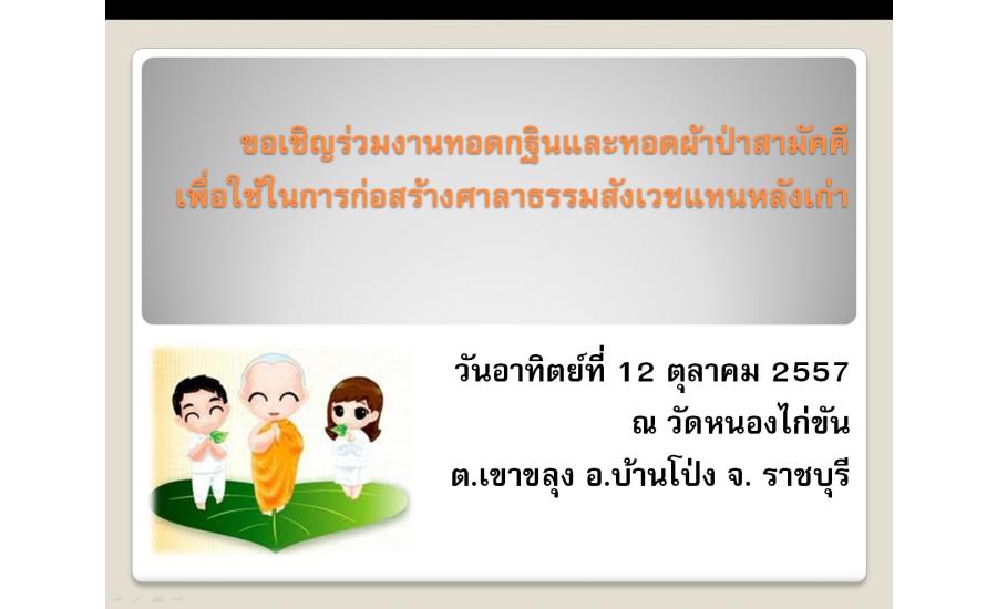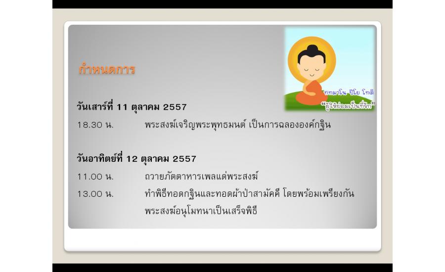 ซึ่งในวันอาทิตย์ที่ 12 ตุลาคม 2557 ทางเจ้าอาวาสได้แจ้งกำหนดร่วมบุญถวานกฐิน มีกำหนดการดังนี้