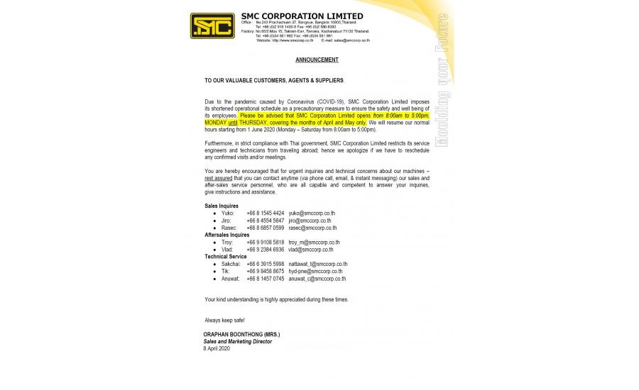 Furthermore, in strict compliance with Thai government, SMC Corporation Limited restricts its service engineers and technicians from traveling abroad; hence we apologize if we have to reschedule any confirmed visits and/or meetings.